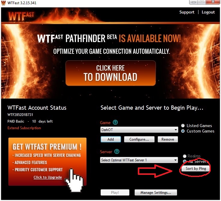 Now you just hit the "Play" button and WTFast will load for a little bit and then run DarkOT client for you.